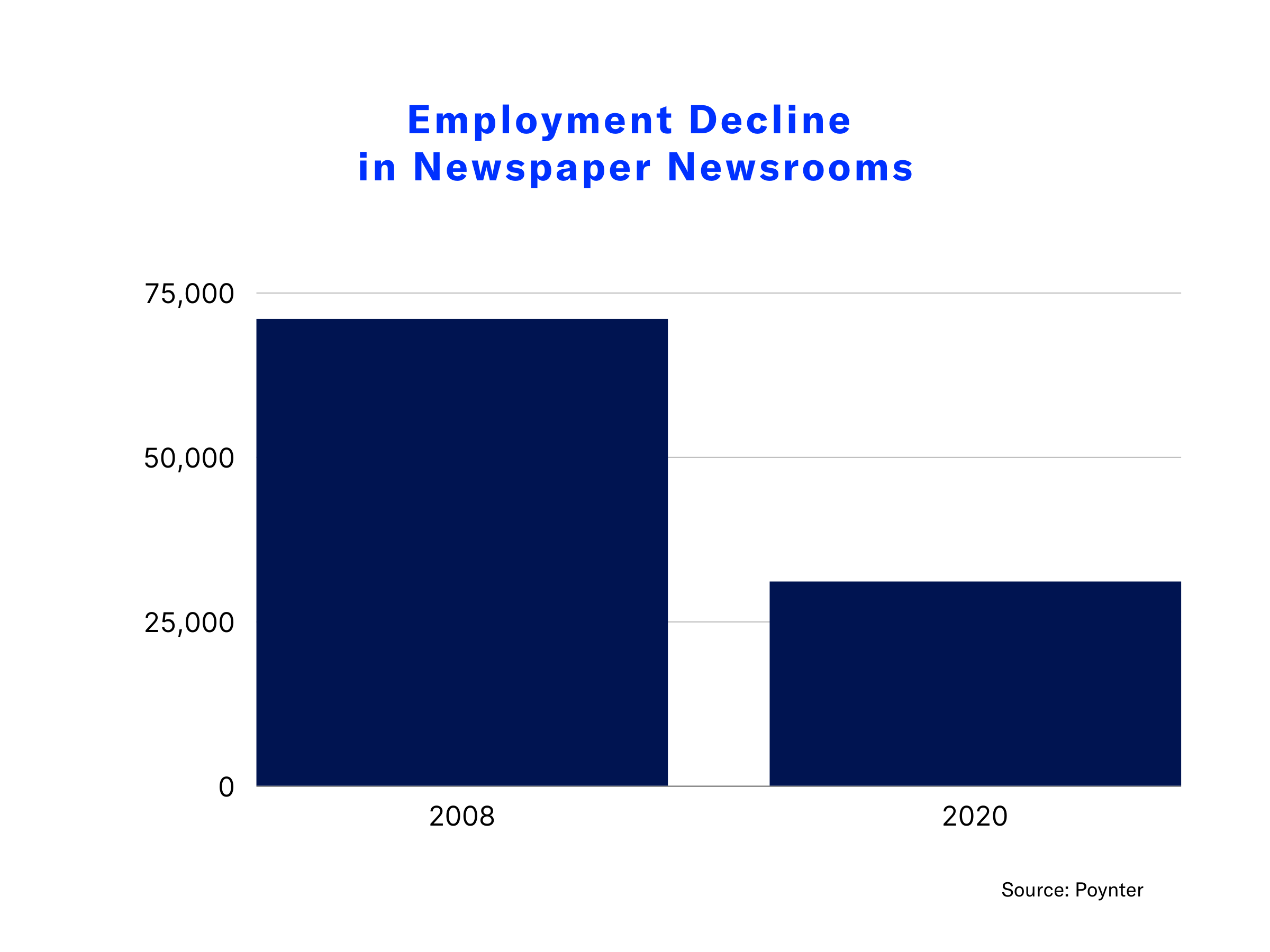 Last year, the Pew Research Center reported that newsroom employment numbers for the entire industry, including print, radio, broadcast, cable, and digital media, had shrunk from 114,000 in 2008 to about 85,000 in 2020, a 26% decrease even before the COVID-19-fueled layoffs and budget cuts happened. Newspapers saw the sharpest decline, going from employing about 71,000 in 2008 to about 31,000 in 2020, a 57% decrease.
